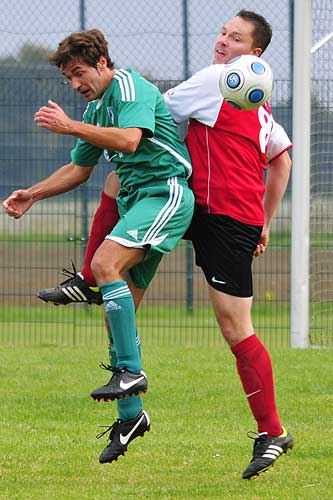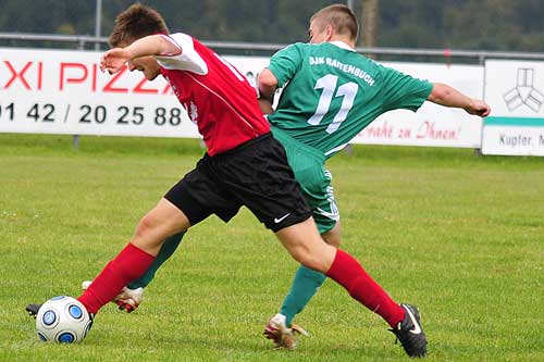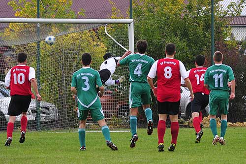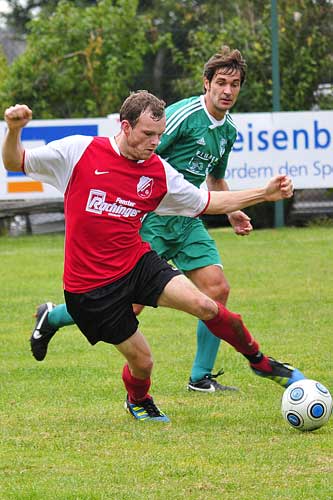 Nach einem tollen Flachpass in die Gasse stand Dominik Buchinger alleine vor dem Bieswanger Tor und vollendete zum 0 : 1 (3. Min.). Überhaupt war es die DJK, die in der ersten Hälfte das Sagen auf dem Platz hatte. Bieswang hatte Mühe mit sich und dem Gegner. Die Chancen für die Bauer-Elf blieben zwangsläufig nicht aus. Drei an der Zahl konnten die Juraner Mitte der ersten Halbzeit aber nicht verwerten, auch dank eines wieder einmal gut aufgelegten SF-Keepers Oliver Ruppert. Nach einer halben Stunde gelang Markus Helneder mit einem „Tor des Monats“ das beruhigende 2 : 0 für die Grün-Weißen, als sein Volleyschuss aus der Linksaußenposition unhaltbar im langen Eck einschlug. Den Gästen muss man den Vorwurf machen, bis zur Pause nicht den Sack zugemacht zu haben. Auch eine weitere gute Einschussmöglichkeit brachte keinen weiteren Erfolg. Dafür kamen die Bieswanger mit einem ihrer wenigen Angriffe noch vor dem Kabinengang zum Anschlusstreffer. Samuel Hilgart startete ein tolles Solo über die Außenposition und flanke zielgenau auf SF-Torjäger Jochen Schwenk, der am „langen Pfosten“ aus etwa 7 Metern unter das Quergebälk einköpfte.