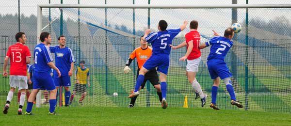 erst ab der Mittellinie an. Sie machten die Räume eng und verhinderten so, dass die sprintstarken Angreifer der Gäste ihre Schnelligkeit ausspielen konnten. Dennoch konnte Weißenburg nach einer knappen halben Stunde nachlegen: Der in der Mitte freigespielte Stürmer des Aufstiegsaspiranten umspielte Heiko Hüttinger im Tor und schob zur vermeintlichen Vorentscheidung ein (0:2). Die Bieswanger ließen die Köpfe aber nicht hängen und zogen die von Trainer Strobel eingeimpfte defensive Spielweise strikt durch. Belohnt wurde die hohe Laufbereitschaft dann in der 35. Minute. Anurson Sachse brachte einen Eckball mustergültig in die Mitte, wo Karl „Air“ Hüttinger in Mittelstürmermanier hochstieg und unhaltbar per Kopf zum 1:2 vollstreckte. Begleitet von einigen Nickligkeiten auf und neben dem Feld ging es dann in die Pause.